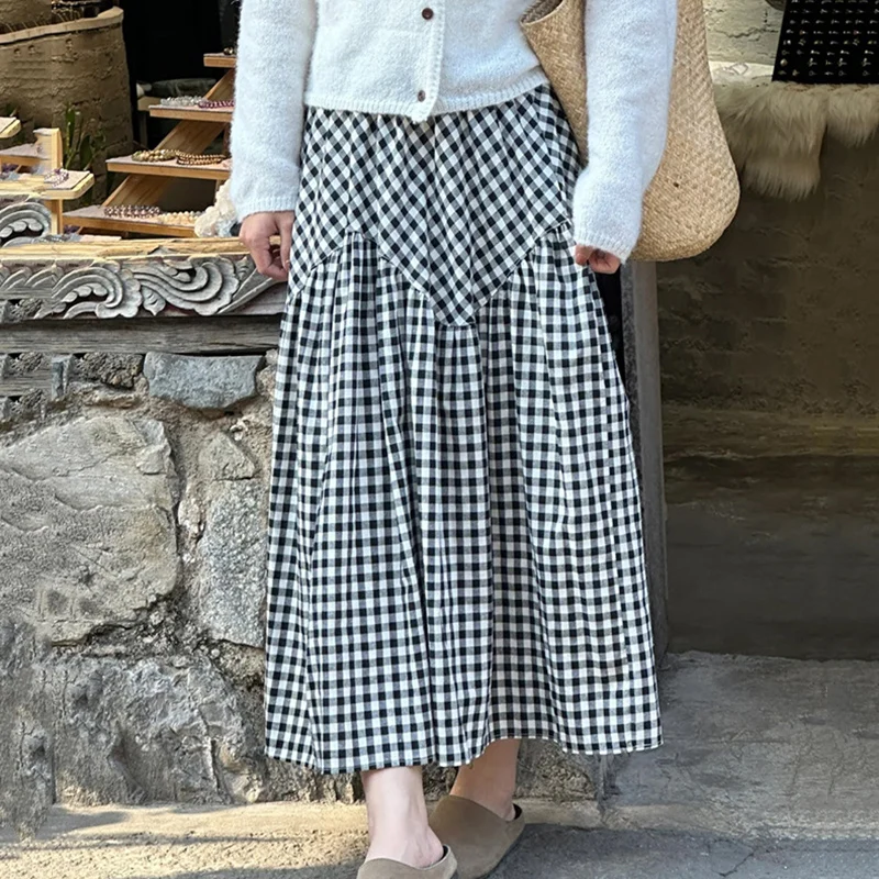 Falda Acampanada A Cuadros Con Plisado Estilo Coreano