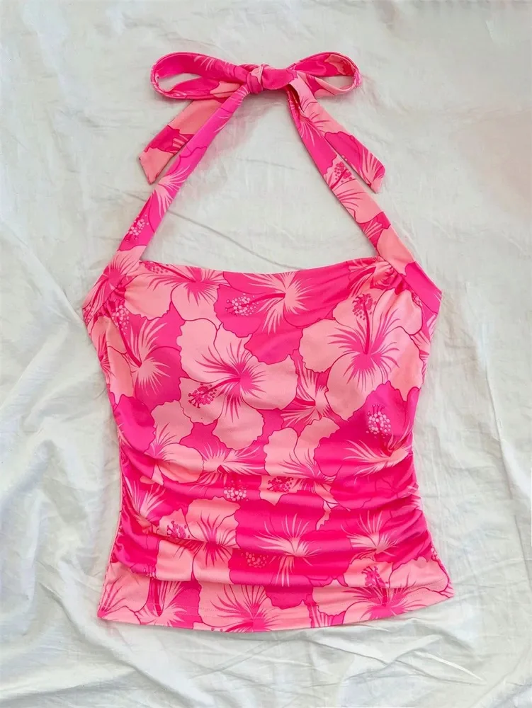 Top corto con cintura fruncida Floral para mujer, Top Sexy con estampado con dibujo de verano, camiseta sin mangas con cuello Halter y espalda descubierta, ropa de calle Y2K