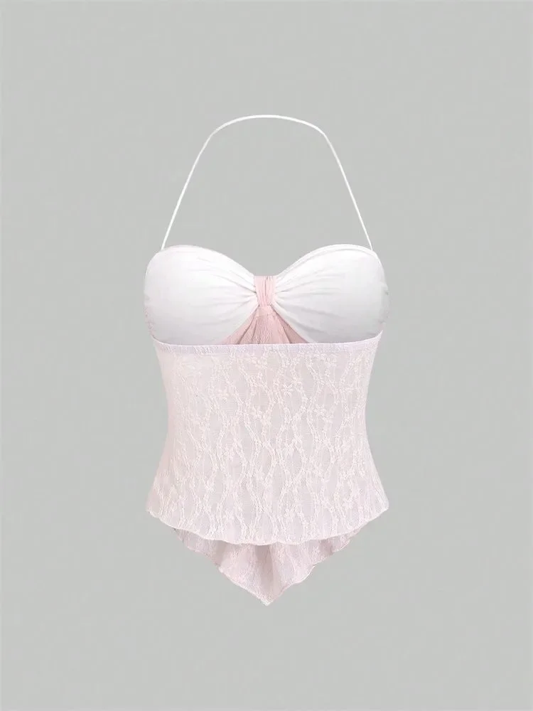 Top Halter de encaje con lazo para mujer, Top Sexy con estampado Floral y hombros descubiertos, Top corto con cuello en V y espalda descubierta, ropa Y2K