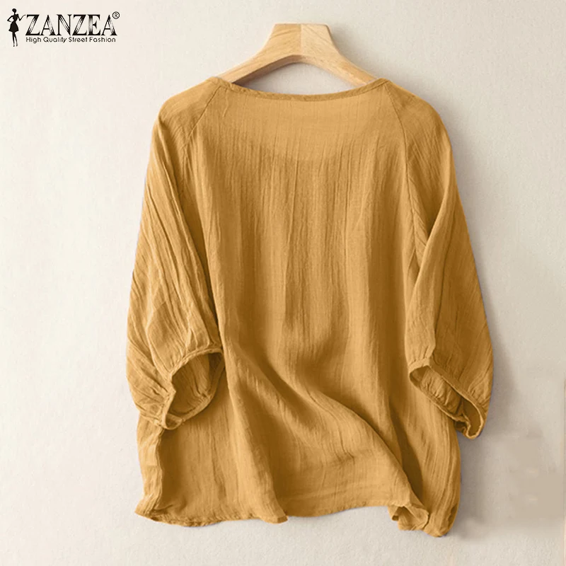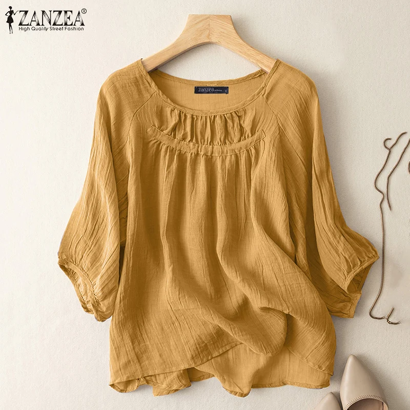 Blusa holgada de mujer de TicoTrendy en color mostaza, con textura arrugada de lino o algodón y mangas tres cuartos. Ideal para un look fresco y casual.